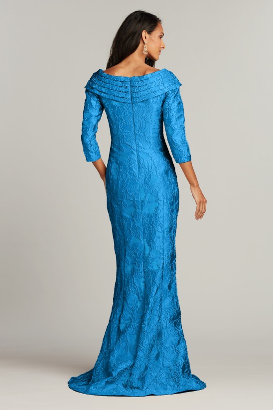 This statement gown, cut from floral jacquard with rich tonal contrast, has a draped asymmetric neckline, fitted bodice, ¾ sleeves, and a modified A-line. We love this skirt’s silhouette for its flattering shape-it strikes the perfect balance between the classic A-line and the mermaid. Concealed back zip. Approx. Length from High Point Shoulder to Hem is 62" Measurements are taken from size 8 / M Dry Clean Imported If you are unfamiliar with our sizing, we suggest you refer to our Size Guide to find your best fit.