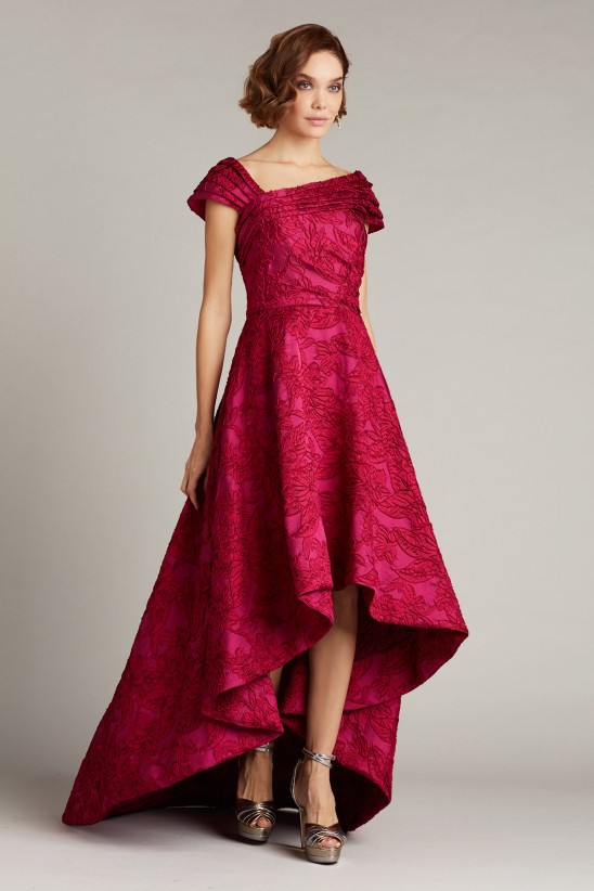 This striking gown, cut from floral jacquard with rich tonal contrast, has a draped neckline, fitted bodice, and a flared skirt with a high-low hem. Now you’ll be able to show off those strappy heels you’ve been longing to wear. Concealed back zip. " Approx. Length from High Point Shoulder to Hem is 42 1/2"" Measurements are taken from size 8 / M Dry Clean Imported If you are unfamiliar with our sizing, we suggest you refer to our Size Guide to find your best fit."