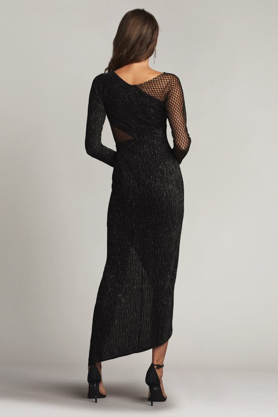 Ribbed velvet is draped to accentuate curves while revealing a midriff cutout on this high-low midi. SHO. Ribbed velvet High neck Draped bodice detail Embroidered-tulle illusion Long sleeves Midi High-low asymmetric hem If you are unfamiliar with our sizing, we suggest you refer to our Size Guide to find your best fit.