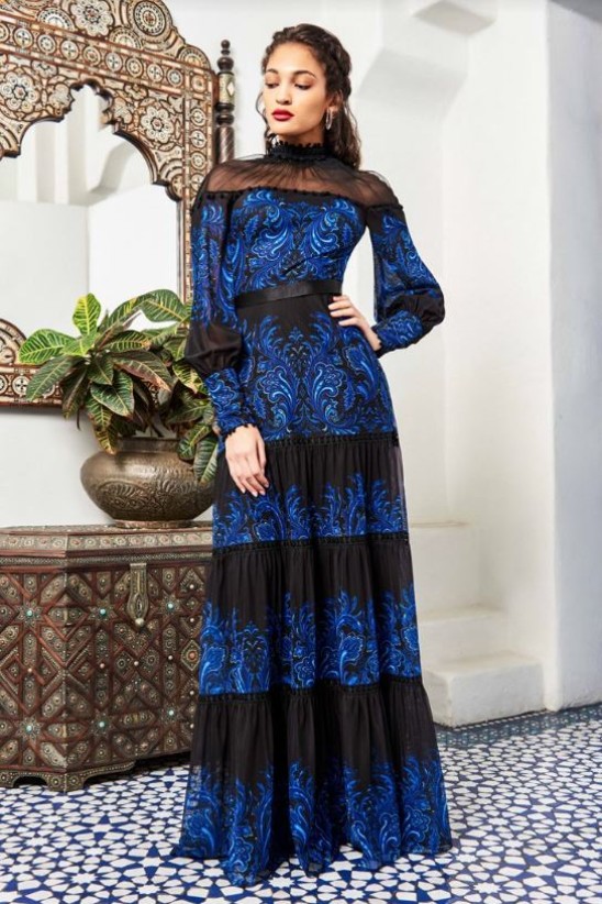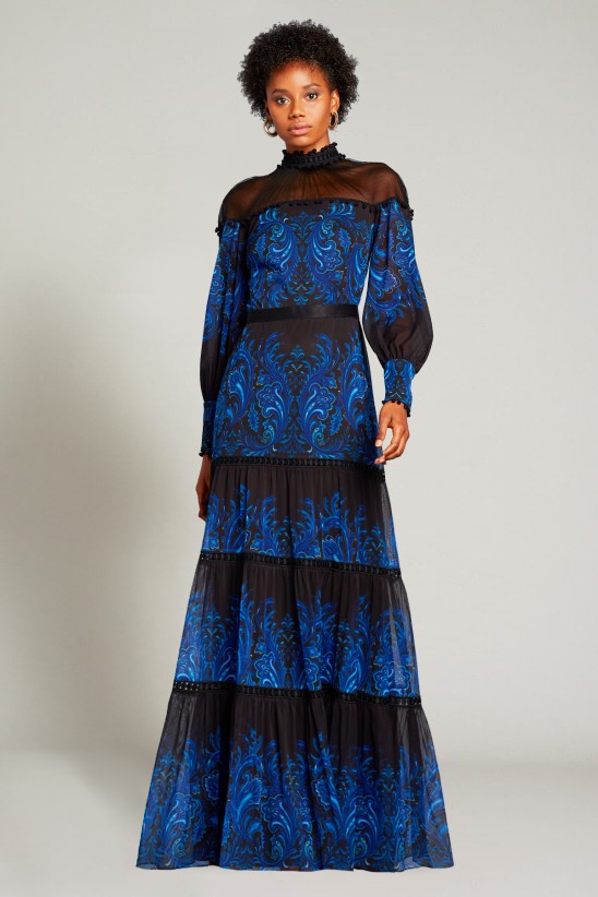 This paisley-printed mesh gown has an off-shoulder tulle illusion, flowy bishop sleeves, an attached stretch ribbon belt, and a tiered skirt trimmed with delicate banding. Lined. Concealed center back zip. " Approx. Length from High Point Shoulder to Hem is 63 1/2"" Measurements are taken from size 8/M Dry Clean Imported If you are unfamiliar with our sizing, we suggest you refer to our Size Guide to find your best fit."