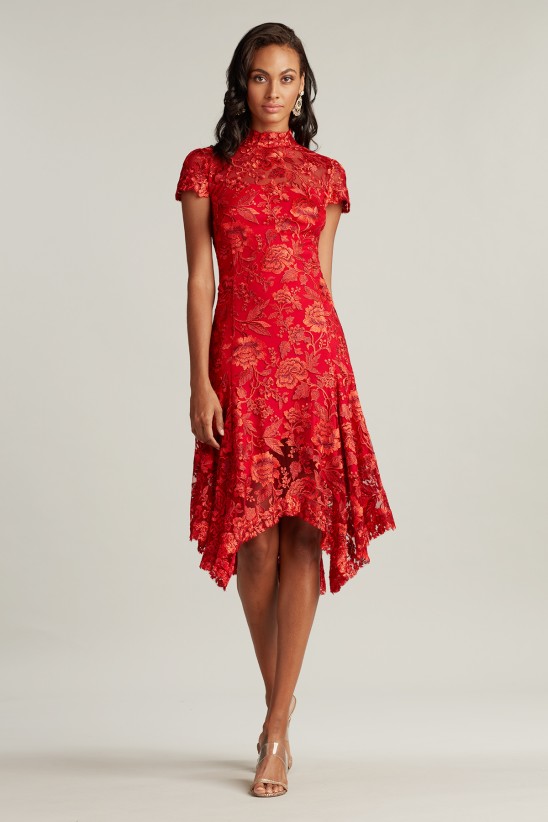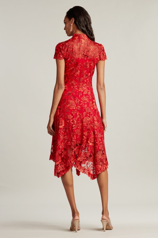 This embroidered tulle dress has a timeless yet modern appeal. A mock collar, illusion neckline, and cap sleeves provide elegant coverage, and a handkerchief hem is sheer and light moves with ease. Fitted jersey lining Approx. Length from High Point Shoulder to Hem is 49" Measurements are taken from size 8 / M Dry Clean Imported If you are unfamiliar with our sizing, we suggest you refer to our Size Guide to find your best fit.