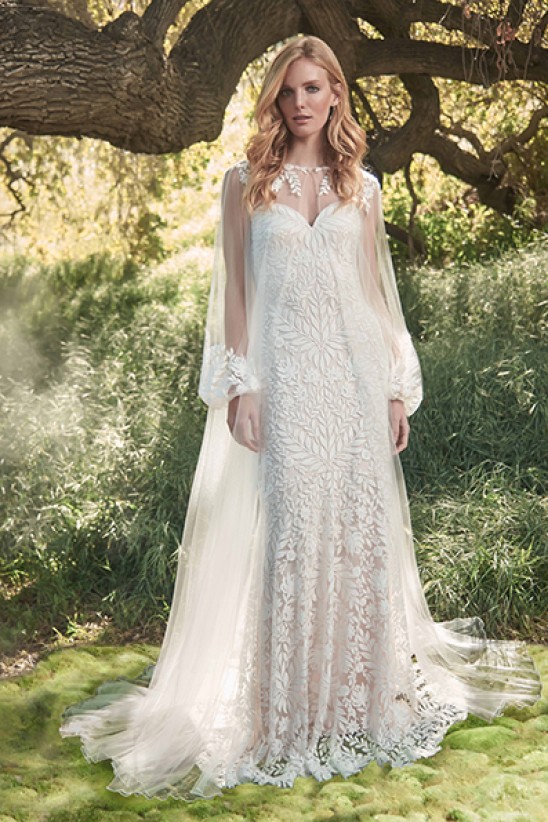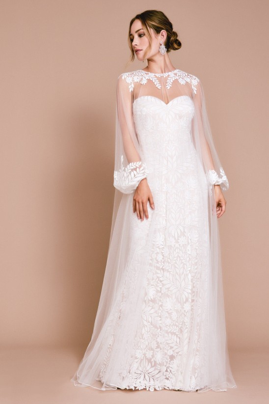 Delicate embroidery graces the neckline and bishop sleeves of this ethereal tulle overcoat with a button closure. Please note, the bridal gown shown underneath is sold separately. Approx. Length from High Point Shoulder to Hem is 66" Measurements are taken from size 8 / M Dry Clean Imported If you are unfamiliar with our sizing, we suggest you refer to our Size Guide to find your best fit.