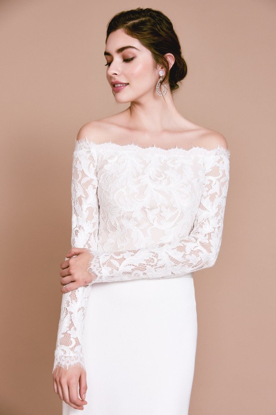 Crafted from lace and crepe, this timeless bridal gown has a fitted bodice with sheer long sleeves, an attached stretch satin belt, and a classic off-shoulder neckline. Approx. Length from High Point Shoulder to Hem is 59 1/2" Measurements are taken from size 8 / M Dry Clean Imported If you are unfamiliar with our sizing, we suggest you refer to our Size Guide to find your best fit.