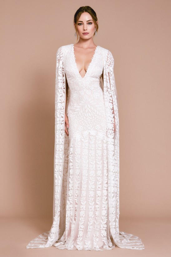 This floor-length bridal cape balances the elegance of transparency with floral graphic embroidery. Pair with our Colborn vine embroidered gown, a coordinating curve-skimming gown also crafted from embroidered tulle. Approx. Length from High Point Shoulder to Hem is 63 1/2" Measurements are taken from size 8 / M Dry Clean Imported If you are unfamiliar with our sizing, we suggest you refer to our Size Guide to find your best fit.