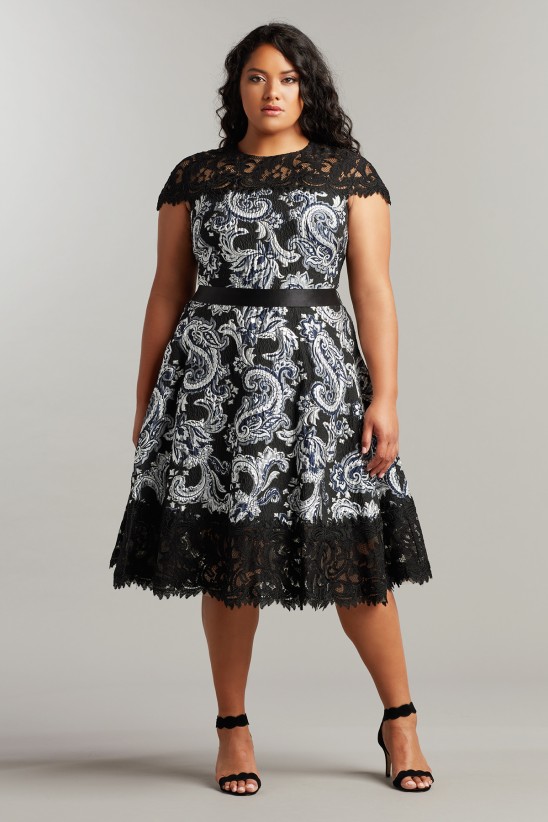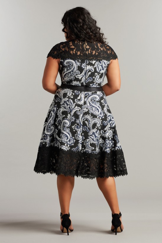 This lace and paisley-motif jacquard dress mixes rich texture with bold contrast. The style is designed with an illusion neckline, cap sleeves, and fit-and-flare silhouette. Concealed center back zip. " Approx. Length from High Point Shoulder to Hem is 45 1/2"" Measurements are taken from size 18Q/2X Dry Clean Imported If you are unfamiliar with our sizing, we suggest you refer to our Size Guide to find your best fit."