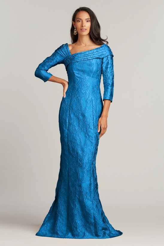 This statement gown, cut from floral jacquard with rich tonal contrast, has a draped asymmetric neckline, fitted bodice, ¾ sleeves, and a modified A-line. We love this skirt’s silhouette for its flattering shape-it strikes the perfect balance between the classic A-line and the mermaid. Concealed back zip. Approx. Length from High Point Shoulder to Hem is 62" Measurements are taken from size 8 / M Dry Clean Imported If you are unfamiliar with our sizing, we suggest you refer to our Size Guide to find your best fit.