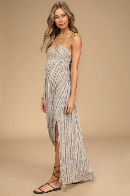 Take those beachy boho vibes to next level with the Lulus Stroll the Sand Beige Black Print Sleeveless Halter Maxi Dress! A boho-inspired striped pattern decorates lightweight woven fabric as it shapes a bodice with a halter neckline and keyhole detail at the center. Wide sashes tie across the open back above a flirty cutout detail. A high waist tops a flowing skirt (with an alluring side slit) that ends at a maxi hem. Elastic at back for fit.