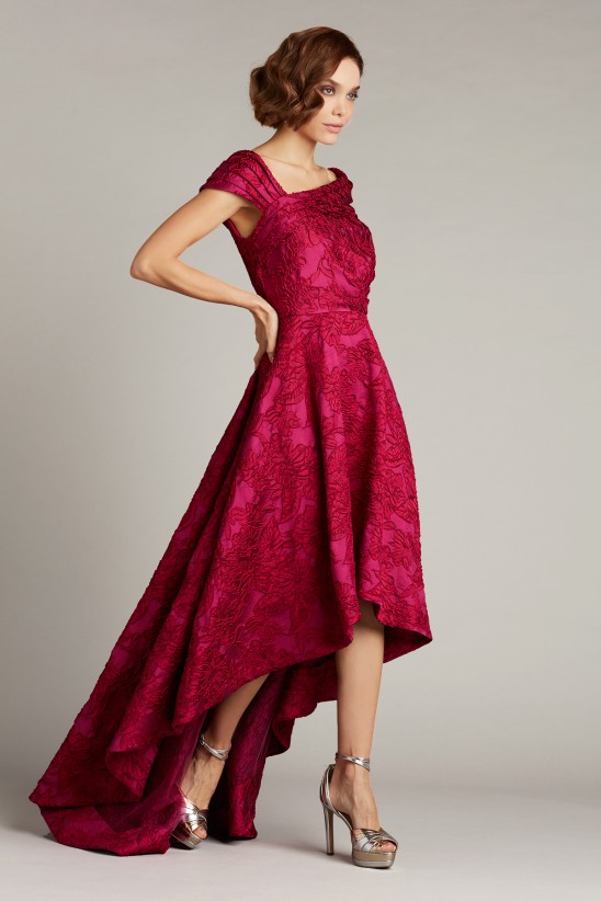 This striking gown, cut from floral jacquard with rich tonal contrast, has a draped neckline, fitted bodice, and a flared skirt with a high-low hem. Now you’ll be able to show off those strappy heels you’ve been longing to wear. Concealed back zip. " Approx. Length from High Point Shoulder to Hem is 42 1/2"" Measurements are taken from size 8 / M Dry Clean Imported If you are unfamiliar with our sizing, we suggest you refer to our Size Guide to find your best fit."