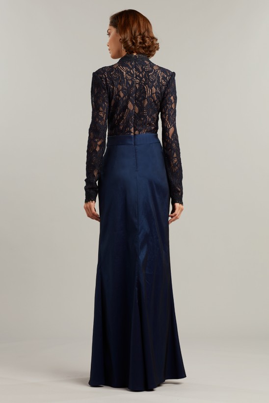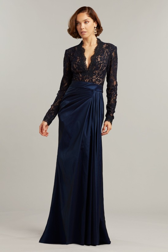 A long-sleeved, fitted lace top pairs with a draped stretch taffeta skirt to create a tailored evening gown that is both effortless and elegant. Stretch lining. Concealed back zip. Approx. Length from High Point Shoulder to Hem is 63" Measurements are taken from size 8 / M Dry Clean Imported If you are unfamiliar with our sizing, we suggest you refer to our Size Guide to find your best fit.