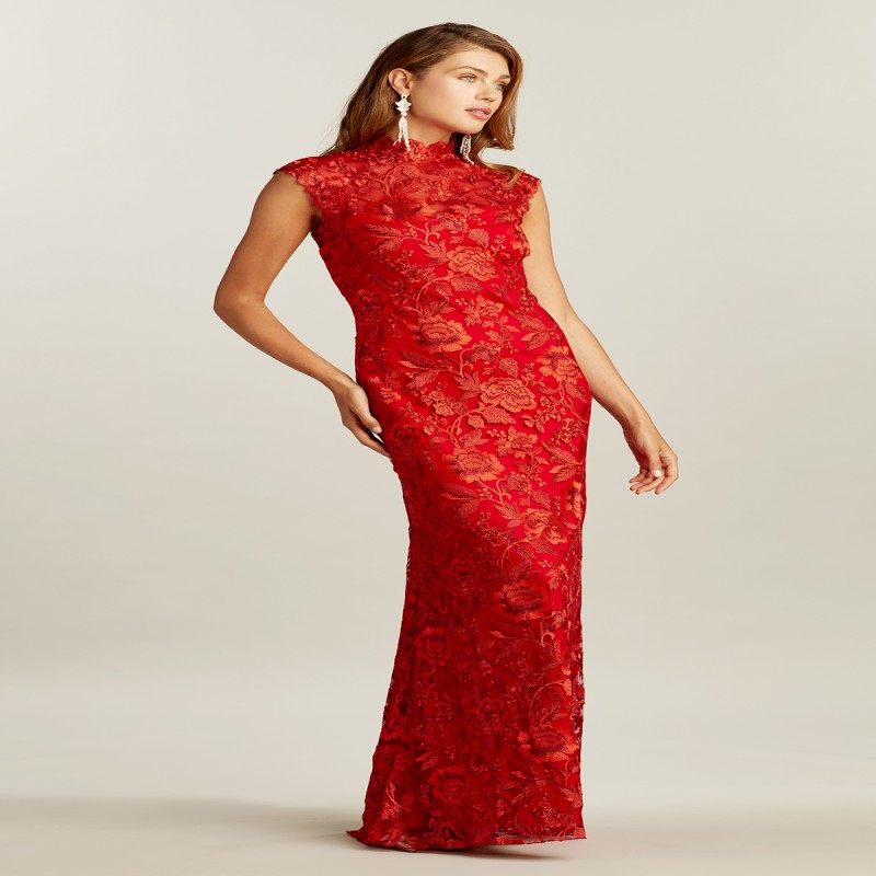 This gown’s elaborate, signature embroidery enjoys a sophisticated luster. The form-skimming silhouette is designed with a high collar, illusion neckline, and a tulle-lined open back. Fitted jersey lining. Approx. Length from High Point Shoulder to Hem is 62" Measurements are taken from size 8 / M Dry Clean Imported If you are unfamiliar with our sizing, we suggest you refer to our Size Guide to find your best fit.