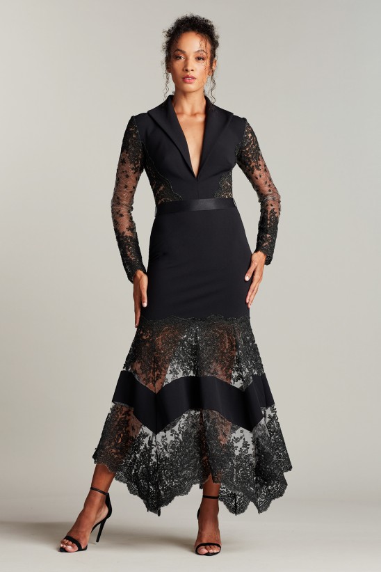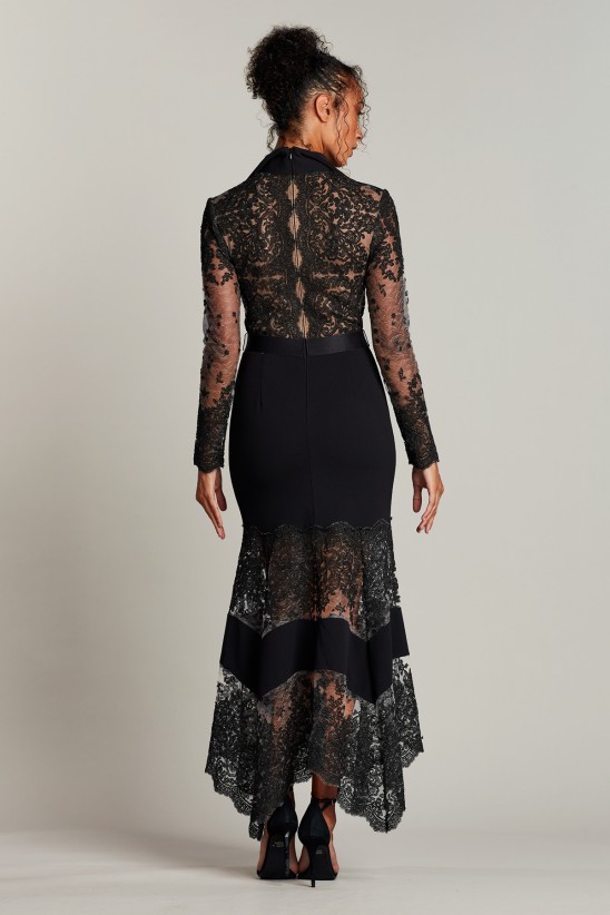 Exquisite tailoring, cord embroidered tulle accents, and a modified A-line deliver a commanding silhouette that pairs sartorial elegance with an impeccable fit. This dress is designed with a gorgeous sheer back, a handkerchief hem, and an attached, stretch ribbon belt. " Approx. Length from High Point Shoulder to Hem is 50 1/2"" Measurements are taken from size 8 / M Dry Clean Imported If you are unfamiliar with our sizing, we suggest you refer to our Size Guide to find your best fit."