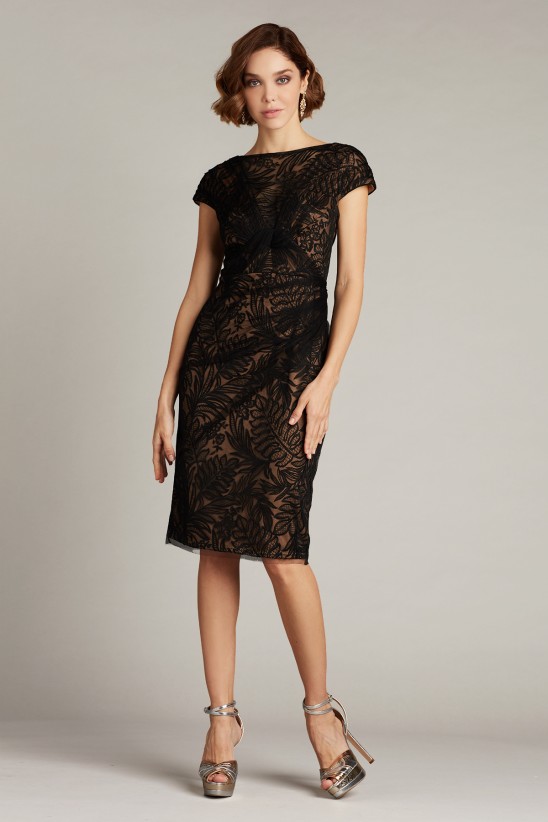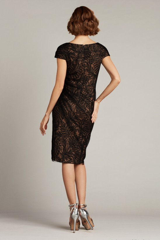 This tailored and timeless sheath is designed with a plunging illusion and a draped tulle overlay, which adds sheer dimension to the style’s palm-leaf embroidery. Concealed back zip. Approx. Length from High Point Shoulder to Hem is 39 3/4" Measurements are taken from size 8 / M Dry Clean Imported If you are unfamiliar with our sizing, we suggest you refer to our Size Guide to find your best fit.