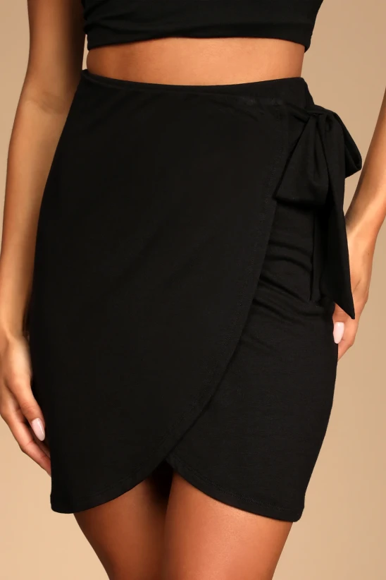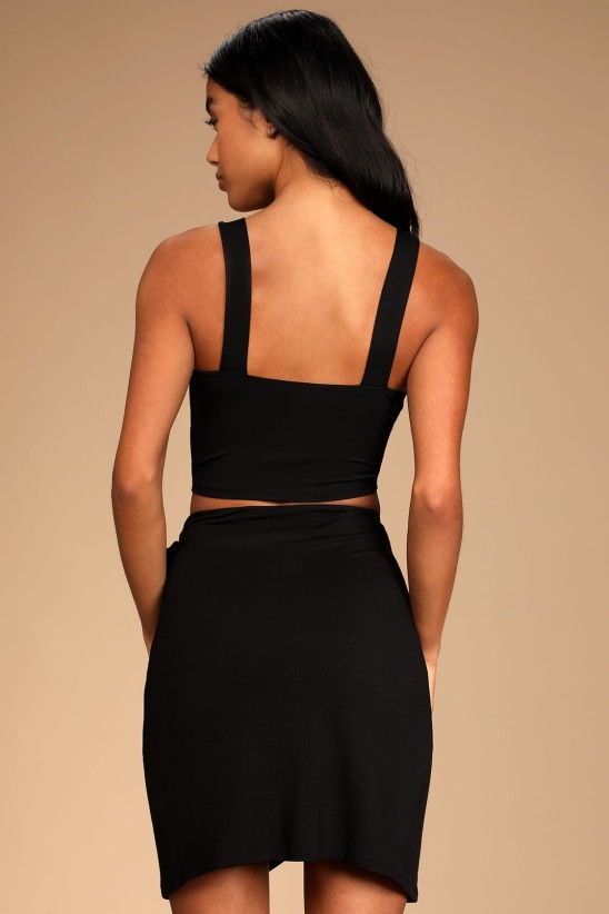 Comfy yet cute is exactly what the Lulus Chic Moments Black Side-Tie Two-Piece Mini Dress is all about! Stretchy jersey knit shapes this two-piece dress that has wide straps, a square neckline, and a fitted bodice with a cropped hem. The matching skirt has a high-waisted fit and an overlapping tulip silhouette that ties at the side and ends at a mini hem.