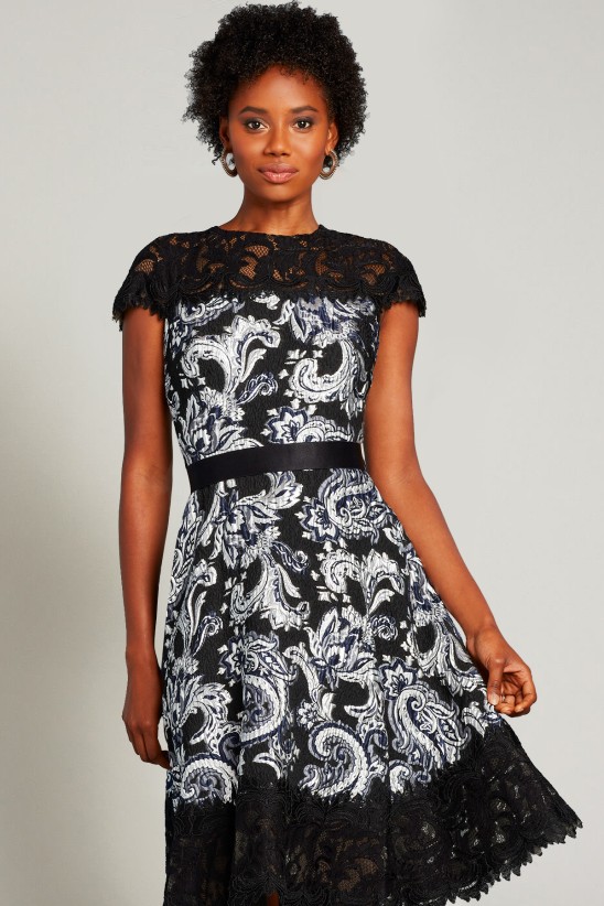 This lace and paisley-motif jacquard dress mixes rich texture with bold contrast. The style is designed with an illusion neckline, cap sleeves, and fit-and-flare silhouette. Concealed center back zip. " Approx. Length from High Point Shoulder to Hem is 43"" Measurements are taken from size 8/M Dry Clean Imported If you are unfamiliar with our sizing, we suggest you refer to our Size Guide to find your best fit."