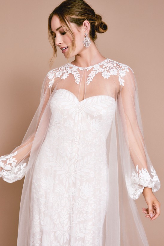 Delicate embroidery graces the neckline and bishop sleeves of this ethereal tulle overcoat with a button closure. Please note, the bridal gown shown underneath is sold separately. Approx. Length from High Point Shoulder to Hem is 66" Measurements are taken from size 8 / M Dry Clean Imported If you are unfamiliar with our sizing, we suggest you refer to our Size Guide to find your best fit.