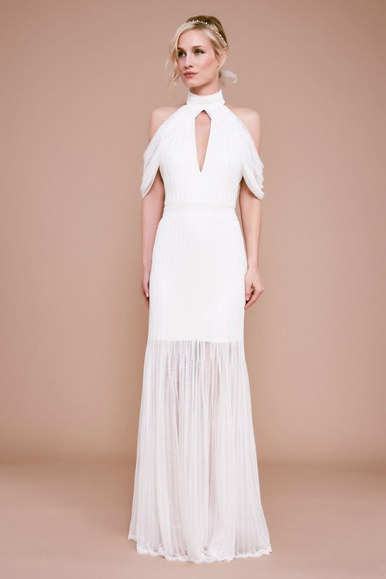 Fine corded lace, off-shoulder draping, and a plunging cutaway neckline create an effortlessly romantic bridal gown. Narrow pleats on the full-length skirt are stitched down to the hipline, where they open up to create sheer volume—without bulk. Approx. Length from High Point Shoulder to Hem is 61.75" Measurements are taken from size 8 Dry Clean Imported If you are unfamiliar with our sizing, we suggest you refer to our Size Guide to find your best fit.
