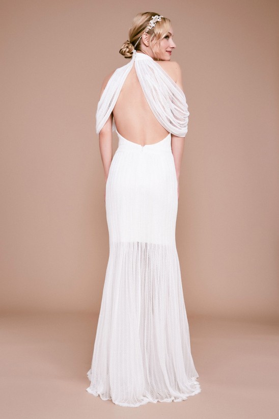 This romantic lace wedding gown enjoys an off-shoulder neckline with scalloped lace trimming, tailored bell sleeves, banded ornamentation, and an elongating tiered skirt. Fully lined. Center back invisible zipper. Approx. Length from High Point Shoulder to Hem is 58.5" Dry Clean Imported If you are unfamiliar with our sizing, we suggest you refer to our Size Guide to find your best fit.