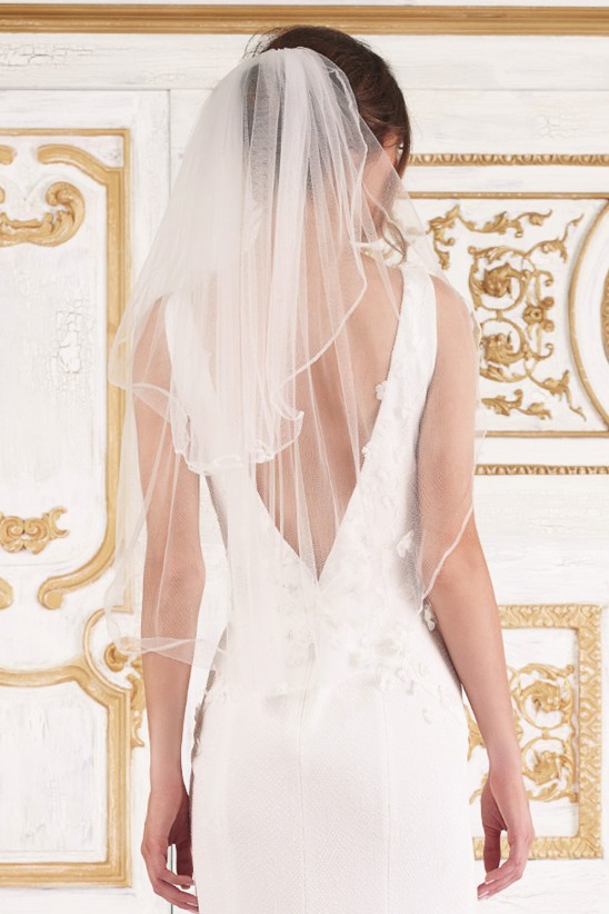 Tiered tulle elbow length veil that can be worn over the face as a blusher or flipped back. Comb attachment. Color: Ivory Dry Clean Imported