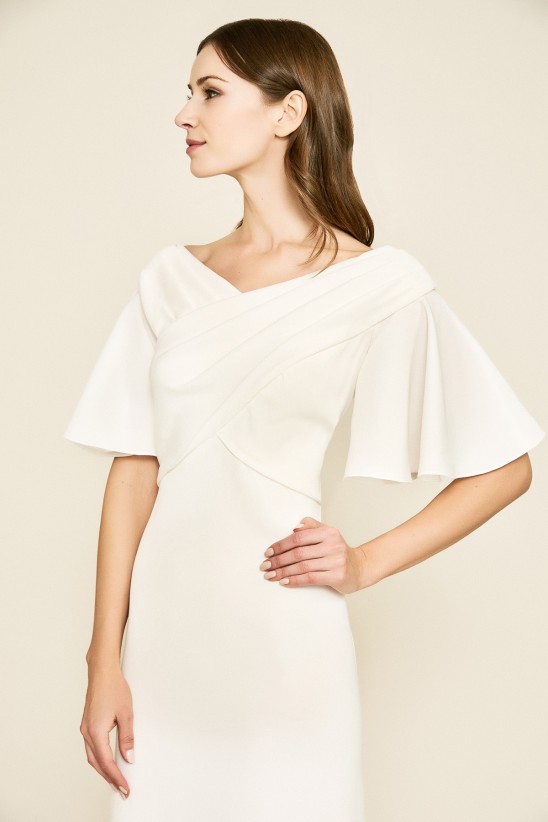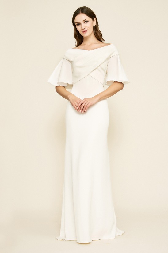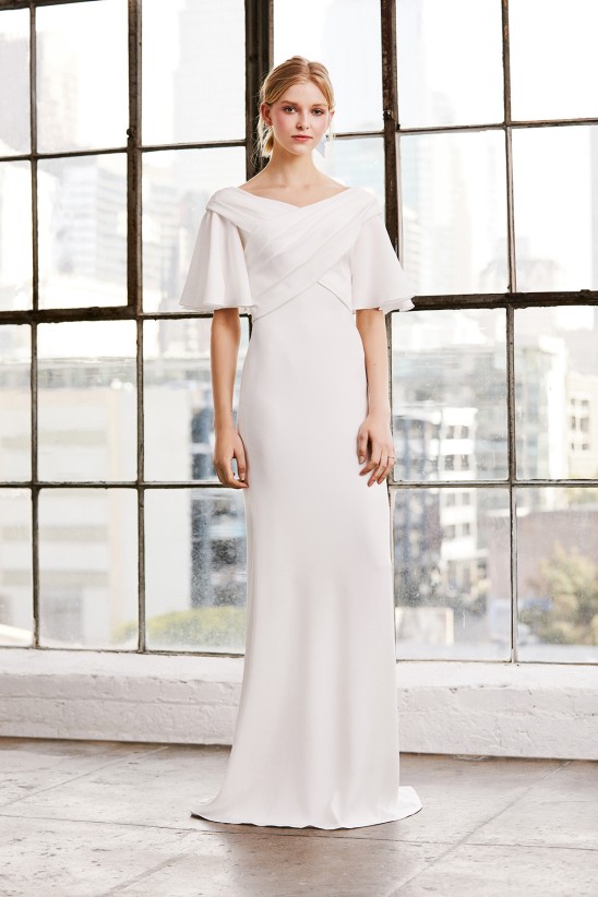 Crepe’s elegant drape underscores this gown’s quiet elegance. Soft, crisscross draping at the bodice flatters the waistline while the silhouette’s graceful neckline kisses the shoulders in an ultra-flattering manner. Center back invisible zipper. Approx. Length from High Point Shoulder to Hem is 61.5" Measurements are taken from size 8 Dry Clean Imported If you are unfamiliar with our sizing, we suggest you refer to our Size Guide to find your best fit.